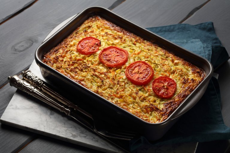 Когато сокът се поизпари, но не напълно (около 10-15 минути на среден котлон), прехвърляме в тава и запичаме зелето в предварително загрята на 180 градуса фурна до приятен загар. Можем да наредим резени домат за повече свежест отгоре.