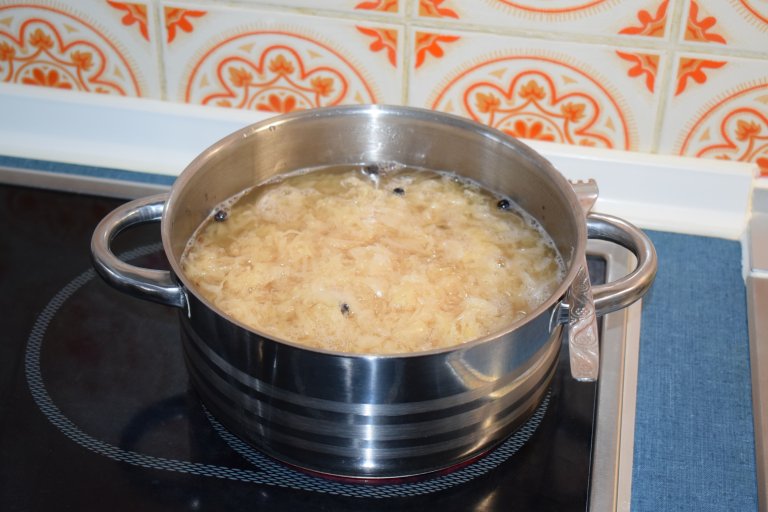 Претрива се силно с ръце, за да пусне соковете си, и се оставя така 30-40 минути. През това време на среден котлон загряваме дълбока тенджера с малко олио и изсипваме зелето, сока му, останалата сол и подправки.