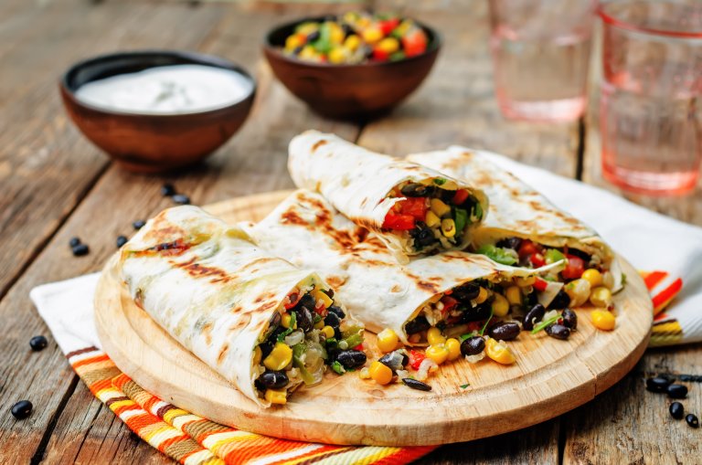 После изсипваме и 100 грама царевица - замразена или отцедена от консерва, и бъркаме отново, докато пълнежът се сгъсти. Можем да добавим и домат на кубчета или люта чушка. Когато сместа е достатъчно гъста, запичаме набързо тортила питки на сух тиган, пълним ги и завиваме.