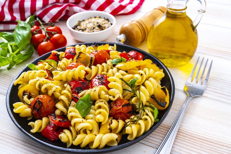 Сваряваме пастата според указанията на опаковката, като през това време приготвяме и соса. За него запържваме няколко скилидки чесън на ситно в малко зехтин, след което добавяме 500 грама чери домати.