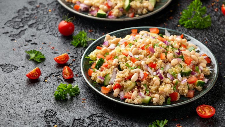 След това слагаме и два зрели домата и една краставица на не много ситно и отново разбъркваме. Накрая прибавяме отцедените боб и киноа, подправяме със сол, ако е необходимо, и разбъркваме салатата. Оставяме я в хладилник за поне час, за да се обединят вкусовете.