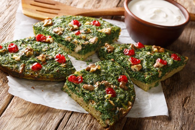 Омлетът се поднася, поръсен с орехи и с гарнитура от прясна салата и маслини.