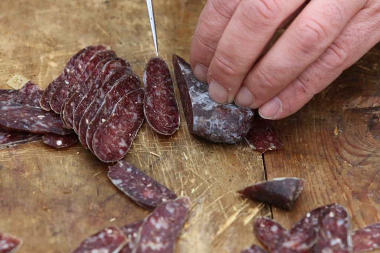Традиционен ароматен колбас от свинско и говеждо, както е описана луканката.