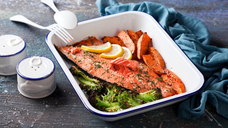 - Сьомга със сладки картофи и броколи