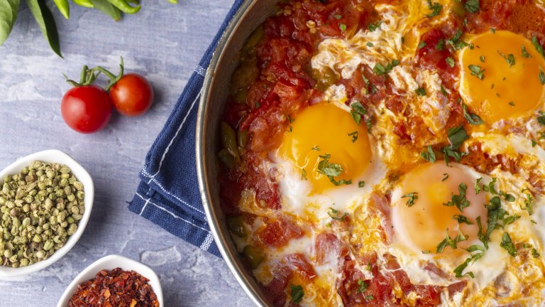 Яйца по турски. Представлява задушени чушки - включително люти, домати и лук, върху които е чукнато яйце, което се готви в зеленчуците. За заклетите любители на мръвката може да се добави суджук, който в турския си вариант е пикантен.