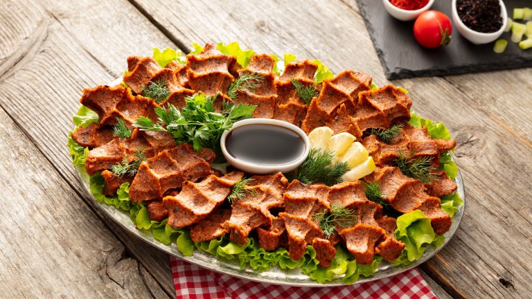 В превод означава сурово кюфте. Навремето наистина е било това - смес от булгур, лук, подправки и сурово месо, и се е появило преди стотици години, когато е нямало достатъчно дърва за горене.