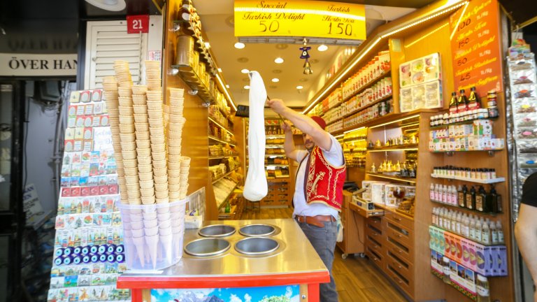 Турският сладолед изобщо не изглежда като сладолед. Той е плътен, дъвче се и може да се яде с нож и вилица. Прави се от мляко, салеп - прах от грудките на орхидеи, сок от мастиково дърво и захар.