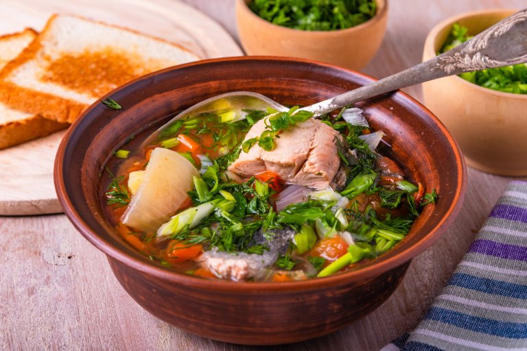 След като се получи апетитен бульон, се пускат парчетата обезкостена и леко сварена риба и се добавя дафинов лист.