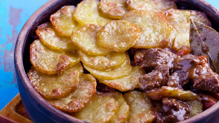 Други задължителни съставки са лук и нарязани на филии картофи. Може да се добавят и други зеленчуци, например моркови, но основното е да се приготви в солиден съд като керамична или чугунена касерола на бавен огън.