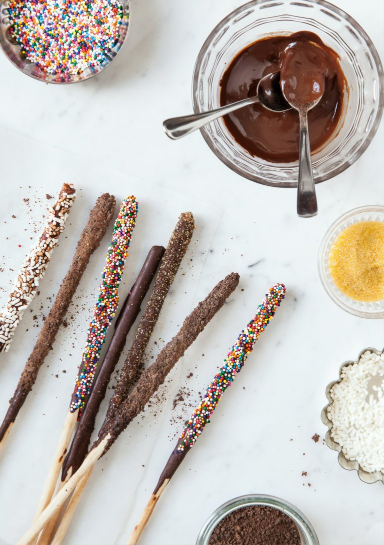 Гризините се потапят в топлите смеси и се оставят шоколадовата част да се втвърди върху метална решетка на стайна температура. Преди това да се случи може да се поръсят с цветни пръчици или друга ядлива украса.