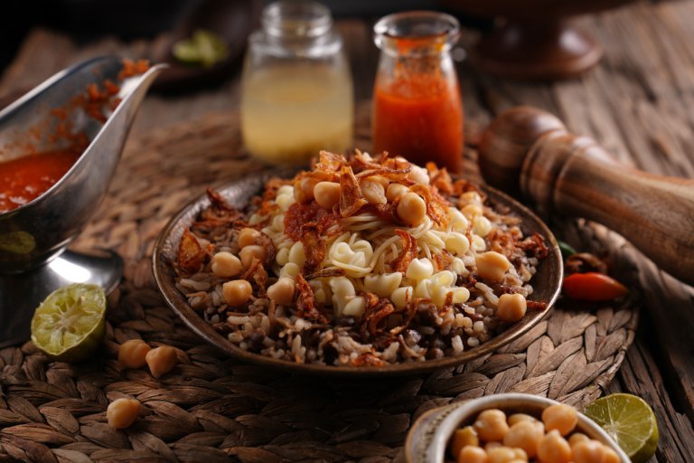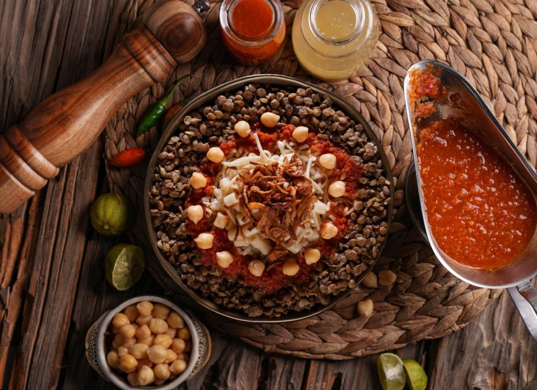 В дълбоките, пищно извезани чинии се озовават едновременно леща, ориз, къса паста от вода и брашно и нахут. Всичко това се подправя щедро с лук, чесън, източни подправки и лют доматен сос.