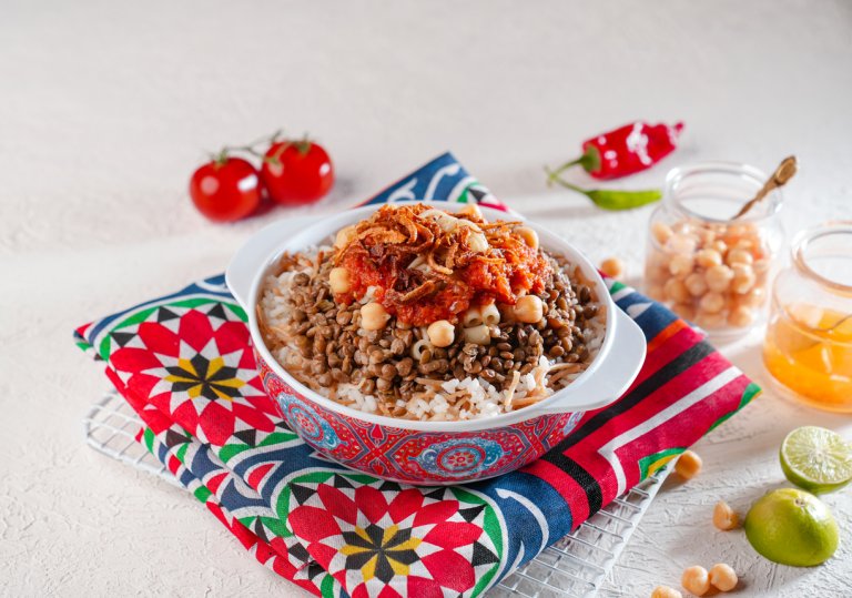 Единственото леко затруднение е, че съставките - ориз, леща, паста и нахут - се готвят отделно и след това се обединяват. Затова ако си вземете кошари от количка на улицата, продуктите ще са сготвени предварително и има риск да не са съвсем пресни.