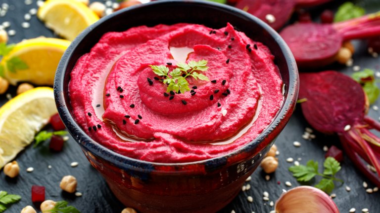 Освен с фалафела, всички свързваме нахута и с пастата от смлените му зърна хумус. Тук разнообразяваме малко с вкуса и цвета и внасяме и още нещо полезно в оригиналната рецепта - цвекло.