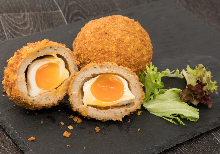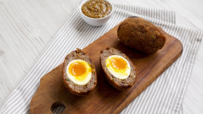 Когато се разреже, жълтъкът на шотландското яйце потича и допълнително овкусява цялата тази хармония.