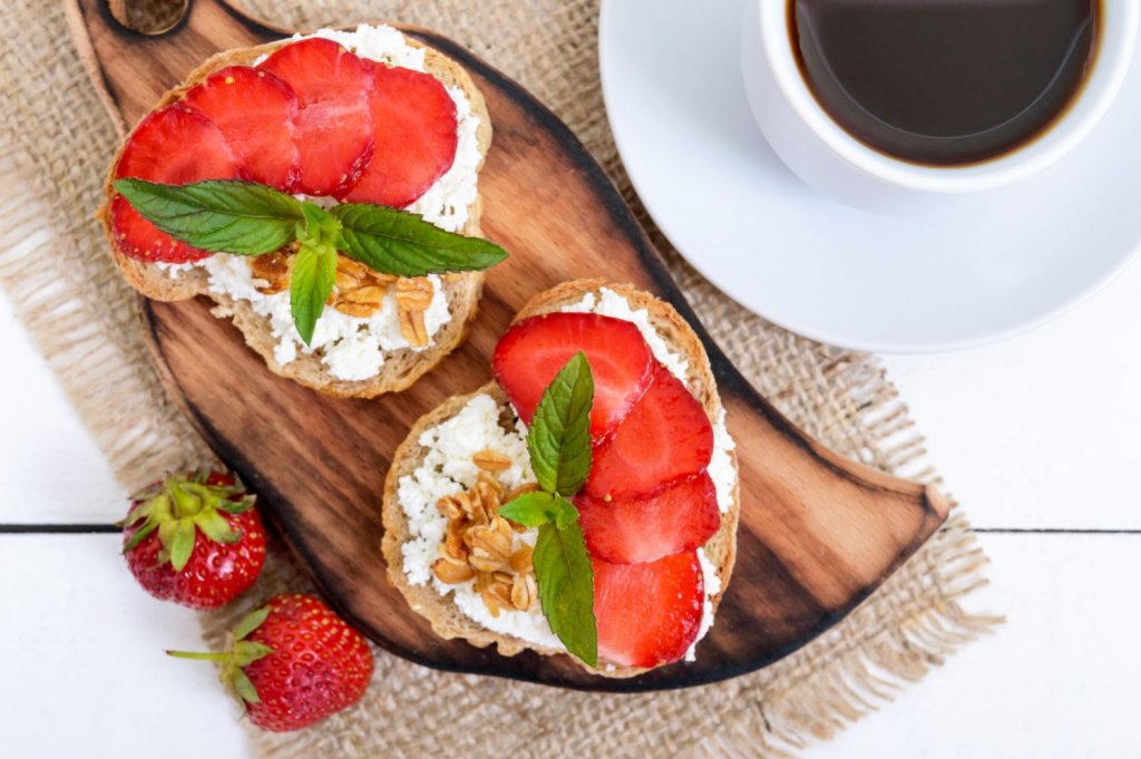 Рецепта ли? Докато кафето се стича в по-дълбока кафена чаша, припичаме две филийки в тостера. Мажем ги със свежо сирене - извара, котидж, натурално крема сирене - и поръсваме с мъъъъъничко пудра захар или подсладител. Редим с любов ягодите и украсяваме, за да се радва не само небцето, но и окото.