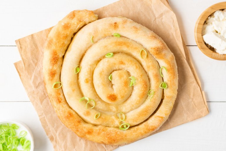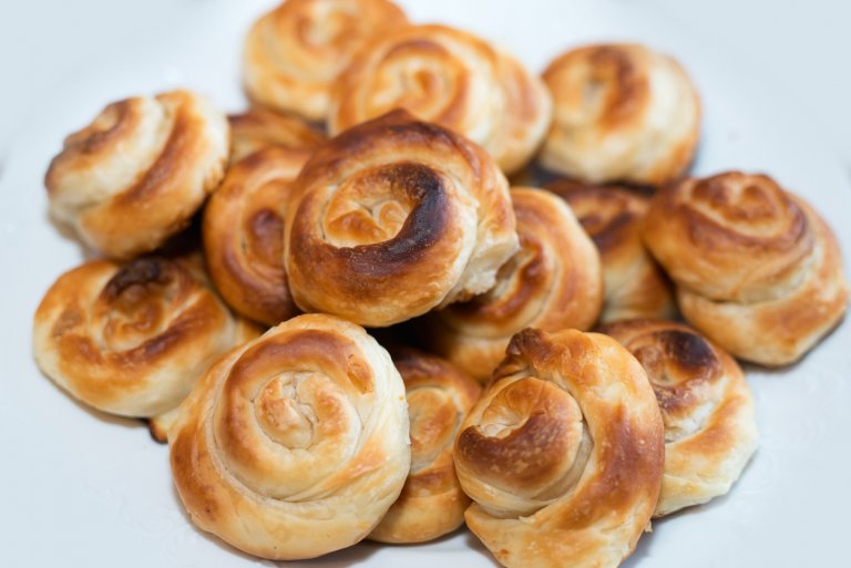 След това кората се разточва и процедурата се повтаря за втората. Може и двете големи кори да се разделят на по-малки. Баницата се оформя на охлювчета по познатия начин.