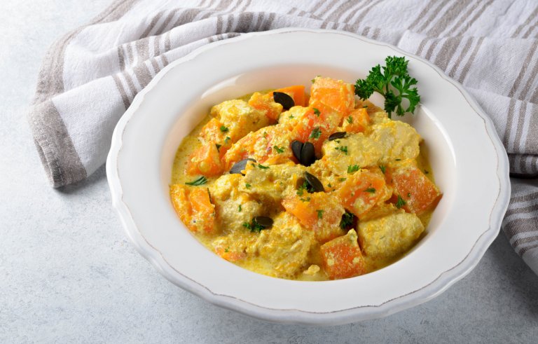 В дълбок тиган се запържват лук, чесън и един морков на ситно. Към тях се добавят около 500-600 грама пилешко на ситни кубчета и се готви, докато месото се зачерви. После е ред на 500 грама тиква на кубчета и чаша кокосово мляко (или течна сметана).