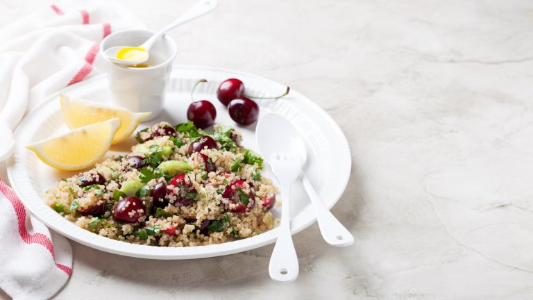 Добавете черешите, зеленчуците и ядките. Разбъркайте добре оцета, зехтина и горчицата заедно със сол и пипер и направете дресинг, който също сложете в кускуса.
