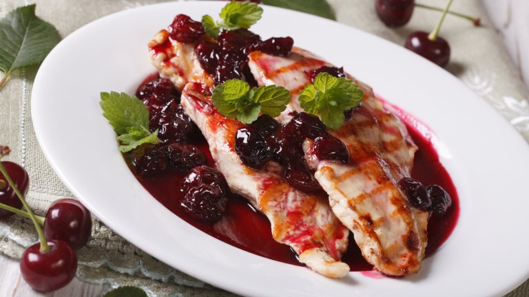 Сложете в малка тенджера виното и захарта и ги оставете да врят, докато течността се изпари наполовина. Намалете котлона и добавете останалите 5 лъжици масло, като бъркате постоянно. Добавете и черешите и сервирайте соса с пилето.