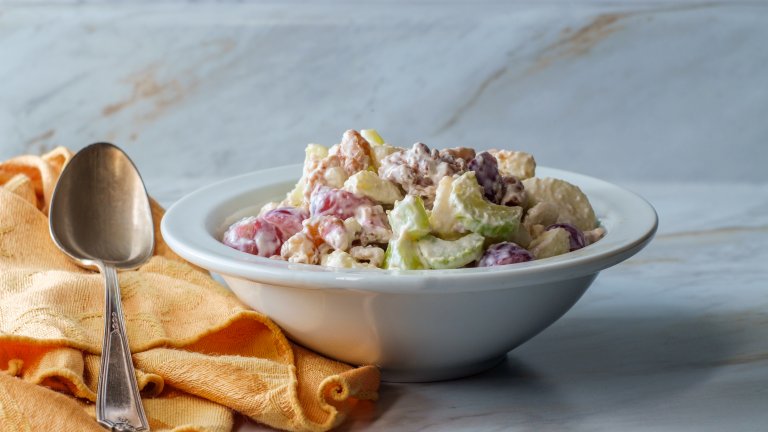 Направете дресинг от майонезата, сметаната, меда и солта. В голяма купа залейте ябълките с лимоновия сок и разбъркайте добре.