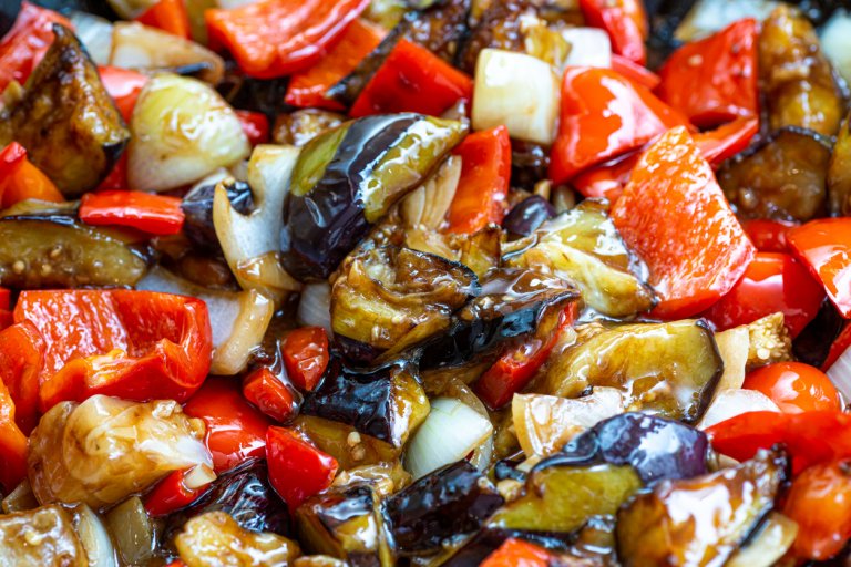 Зеленчуците се изсипват в голяма и дълбока поне 4-5 сантиметра тава. Върху тях се изливат олиото, захарта и подправките и всичко се разбърква добре. След това тавата се покрива с алуминиево фолио, което се надупчва с вилица, и се слага в силно загрята на 240-250 градуса фурна.