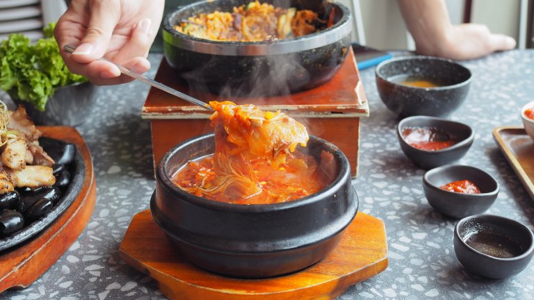 Тук - заради дългите и студени зими, храната освен люта, се яде и гореща. Типично за корейските ресторанти е клиентите сами да ги приготвят част от храната на котлони или печки на самата маса, включително известното корейско барбекю, както и различни видове супи, така че да се ядат възможно най-топли.