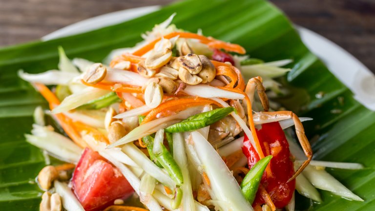 Едно от най-известните ястия в Тайланд - освен нудлите Пад тай и супата Том ям, е салатата със зелена папая Сом там. Тя има много вариации - с добавени яйца или скариди, но е неизменно люта и овкусена с тайландски люти чушки, наречени птичи чилита. Те се сервират и към мезета като наденицата Сай крок и сушеното свинско Му дад.