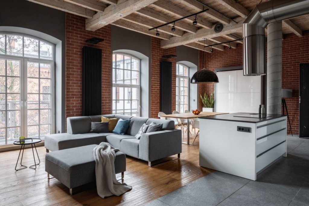 Жилище в индустриален или стиймпънк стил, където кафе машината е разположена в кухня с циментови неизмазани стени или колони, или пък стени с външни тухли.