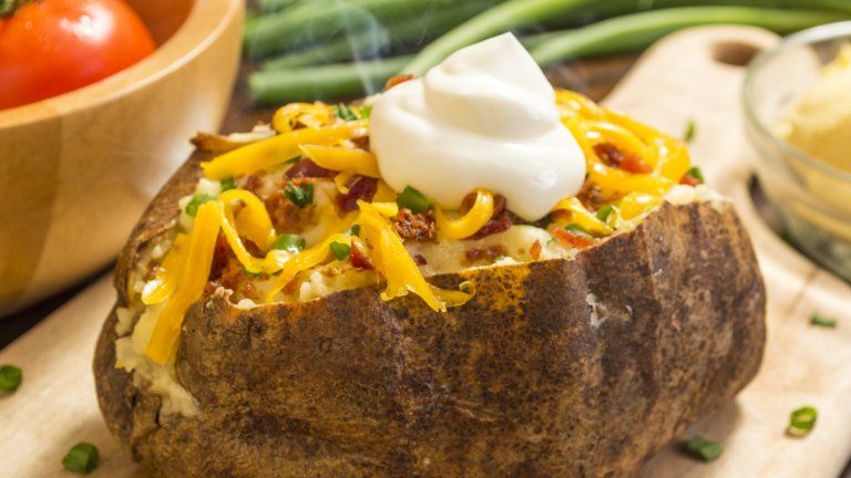 Когато картофите станат меки ги разрежете на две, подправете със сол и пипер и намачкайте вътрешността с вилица. Добавете масло и настърган кашкавал и върнете в микровълновата, за да се разтопи сиренето. Сервирайте със сметана.