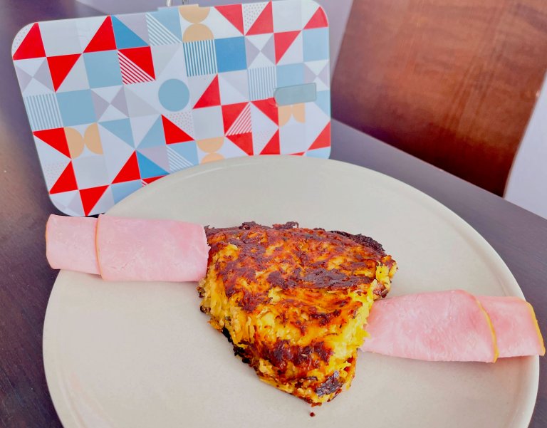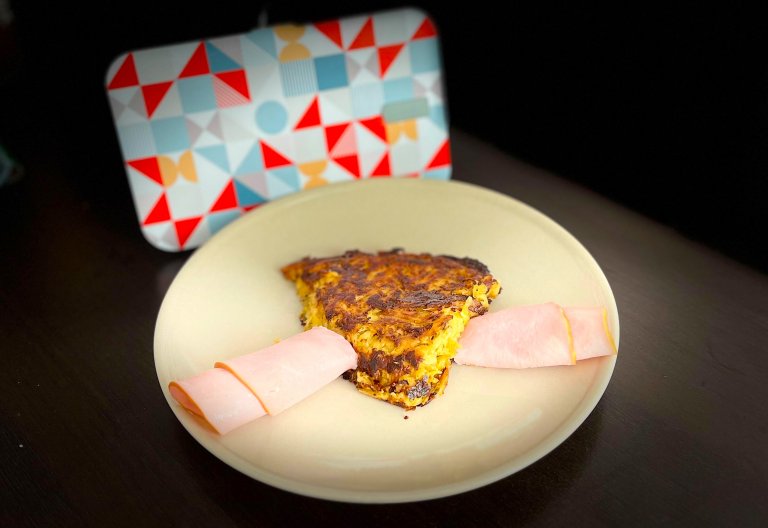 Подходящ е за обяда в кутия, защото се приготвя на тиган, без да се цапа една камара съдове, и е с продукти, които обикновено винаги имаме у дома - картофи, яйца, малко сирене, лук и български подправки.