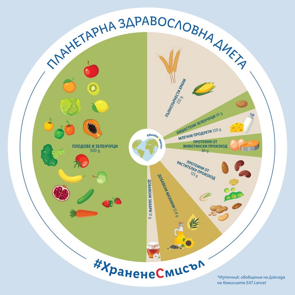 Планетарният режим на хранене е научно базиран модел за консумация, който според учените е оптимален за човешкото здраве и устойчив за околната среда. Създаден от комисията EAT Lancet, той насърчава консумацията на продукти на растителна основа с малък въглероден отпечатък, без да изключва останалите основни хранителни групи. Учените дават това препоръчително съотношение между свежи плодове и зеленчуци, пълнозърнести храни, растителни протеини, млечни и месни продукти и другите хранителни групи.
