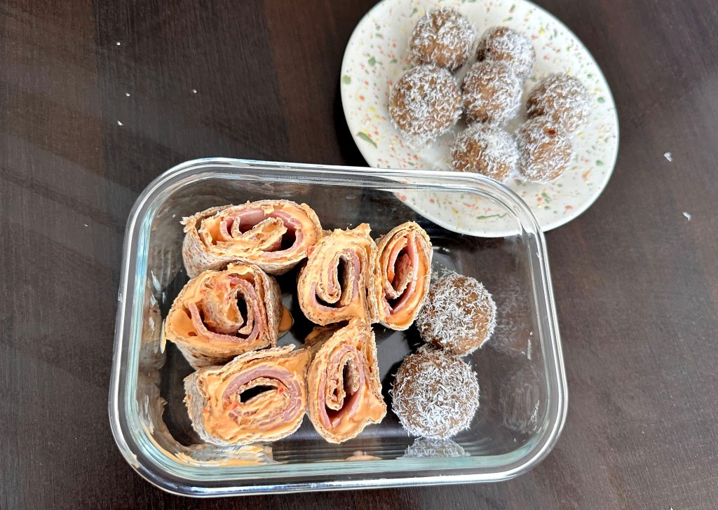 В случая там се намират пълнозърнести тортили, а от хладилника изскачат топено сирене и шунка, след което за минути имам симпатични рулца за обяд. И даже остава време за нещо сладко.