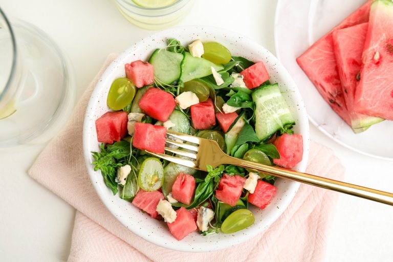 Освен това се приготвя наистина бързо - всички съставки се режат в дълбока купа, овкусяват се, разбъркват се и салатата се хапва. Може да престои леко, за да се смесят вкусовете, но не много, защото динята пуска доста вода.
