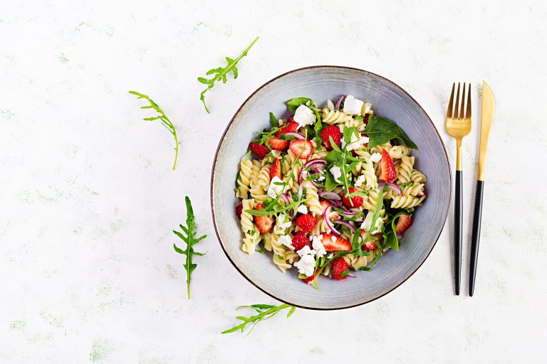 Всъщност основните съставки тук са паста и ягоди, които да носят соления и сладникавия привкус. Всичко друго е въпрос на налични продукти и подправки.