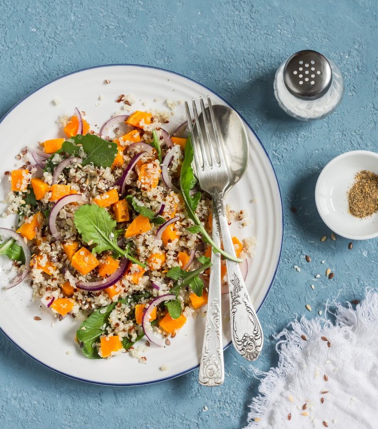В голяма купа се слагат нарязания на полумесеци лук, руколата, тиквата и киноата. Разбъркват се внимателно и се поръсват със сусама и лененото семе.