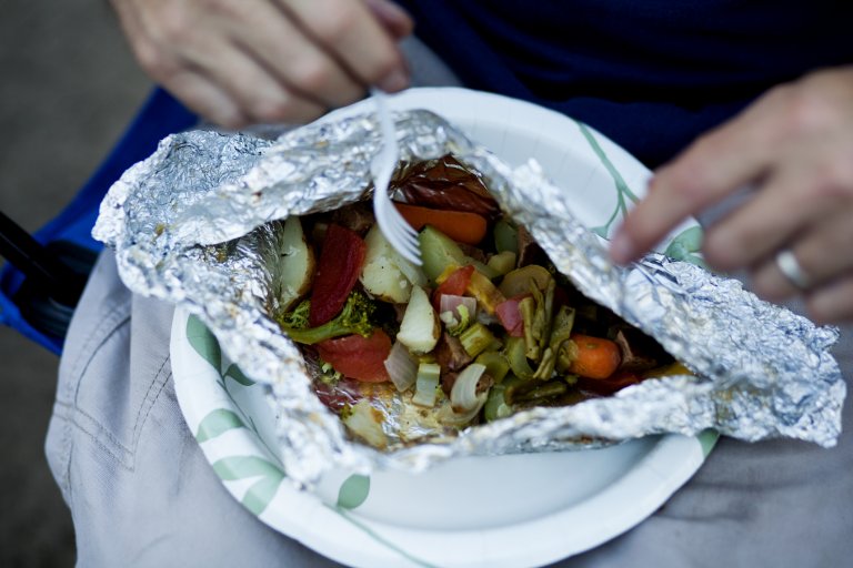 За самото изпичане поставете пакетите в жар и ги затрупайте с още жар, както се прави с печени картофи на лагерен огън. Около 40 минути трябва да са напълно достатъчни, за да е готово всичко.