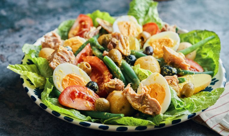 Салата "Нисоаз" е лятото и морето, кацнали на масата в чиния. В нея има всичко, което глези небцето - свежи зеленчуци, пресни подправки, твърдо сварени яйца и морски дарове. Макар че отначало ястието е по-пестеливо, отколкото е в момента.