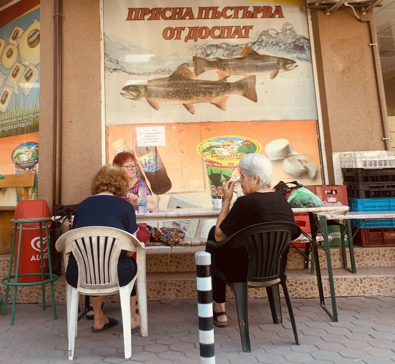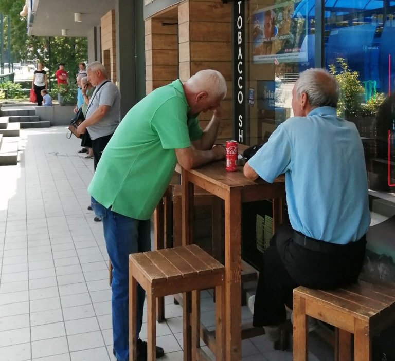 Те са се отпуснали на един крак и подпрели лакът на високи масички, облепени с избелели реклами на бири и безалкохолни, пият кафе в картонена чашка от машина и цъкат непринуден моабет за политиката, инфлацията и летните жеги - време да минава.