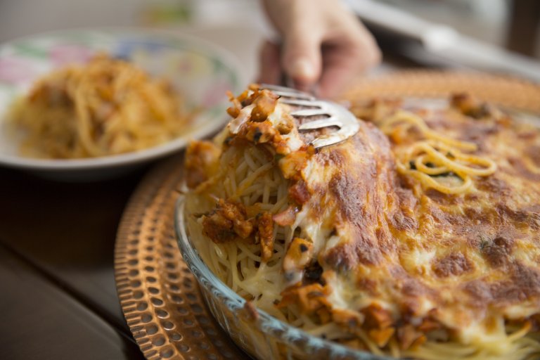 Тъй като всичко ще се пече във фурна, не сготвяме напълно нито една от съставките. Спагетите също се варят до полуготовност, за да не се кашнат в тенджерата.