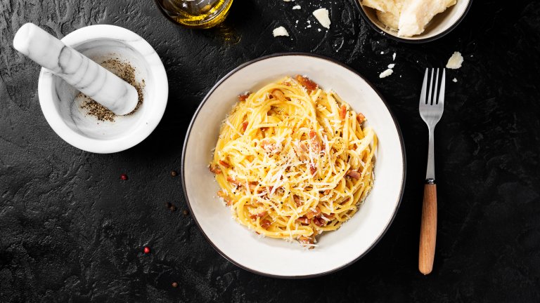 Днес канонът казва, че в карбонара се допускат само 4 съставки - паста, яйца, сирене пекорино и гуанчале. Сметана, бекон, масло и особено чесън ще докарат италиански шеф до прединфарктно състояние.