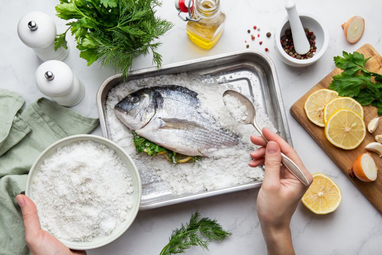 В купа смесете морската сол и белтъците, докато солта се овлажни равномерно. В тава върху хартия за печене разпределете част от сместа, върху нея - рибата, която след това плътно покрийте с останалата сол. Ястието трябва да се пече около 30 мин.