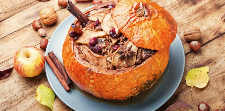 След това с него се пълни издълбаната тиква и се пече на 180 градуса до омекване на тиквата или за около 3 часа.