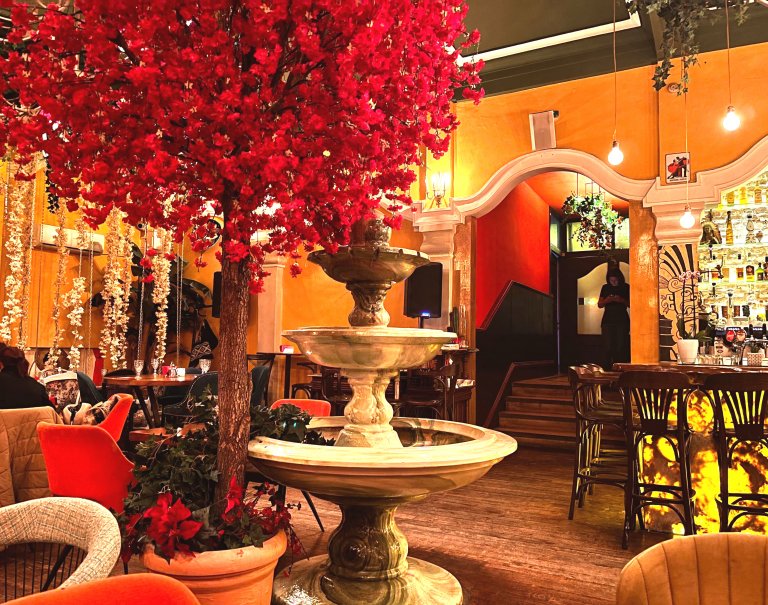 Централно място в нея заема мраморен шадраван и дърво с естествен ствол, от което се вият цветчета в яркочервено. Същият наситено червен цвят се повтаря и в дамаските на мебелите. Масите са от масивно естествено дърво, което придава още повече топлота.