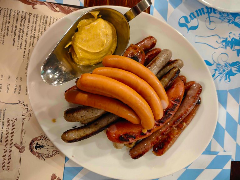 Ние заложихме на класиката - вурстове, картофки, немски кисели краставички и ястия, запечени на тиган. Порциите са с големина, достатъчна да нахрани и много прегладнял човек. Платото вурстове съдържа шест вида запечени колбаси и свърши последно, защото порцията наистина е огромна.