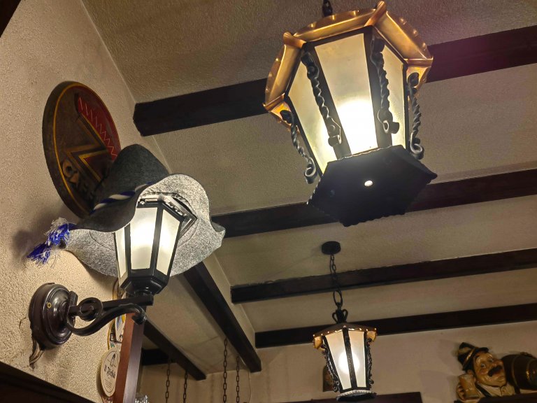 Над бара е подредена впечатляваща колекция от бутилки немска бира, а винтидж фенерите веднага подсказват откъде идва името на бирарията.