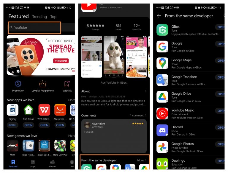 Това се случва чрез приложението на трета страна Gbox. То можеше да се използва и досега, но вече е достъпно в самото AppGallery, както и в Galaxy Store, GetApps и други. Намирате го с търсачката в някой от магазините и го инсталирате. Има обаче и дори по-лесен вариант.