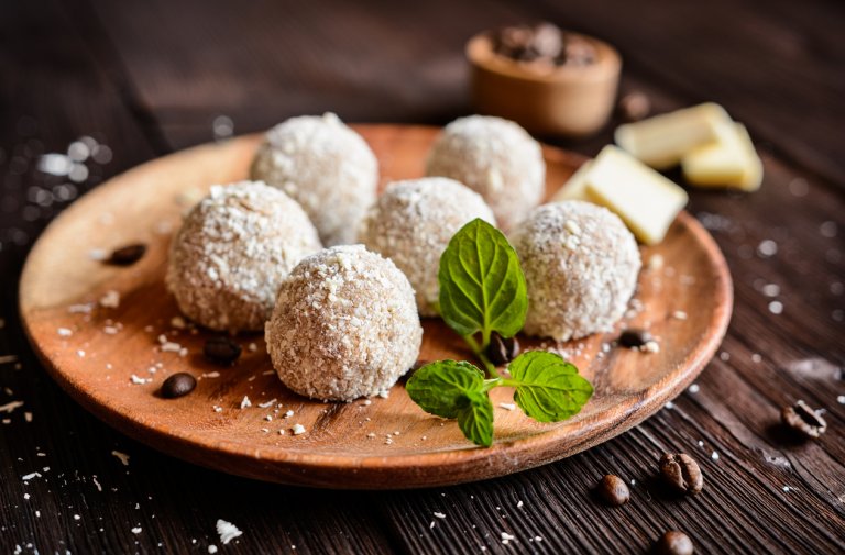 С тези изкусителни трюфели от бял шоколад ще върви чудесно охладено плодово вино и приятна компания, разбира се.