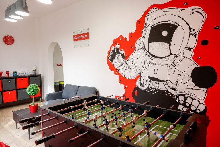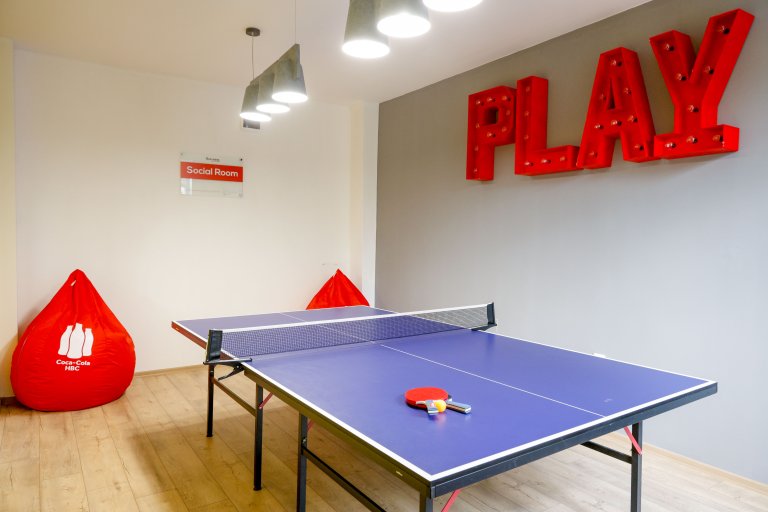 Зоната в споделеното пространство е организирана в три отделни помещения - специално обособено място за настолни игри, работа по проекти и обмен на идеи, chill зона с джаги за почивка и разтоварване, както и уютен кът за учене и общуване в свободна и приятна атмосфера.