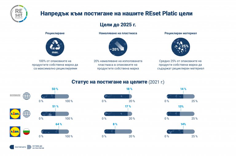 Средната стойност за Lidl на международнo ниво бележи напредък от 17%, като по този начин компанията се доближава още повече до постигането на груповата цел за намаляване на пластмасата с 20% до 2025 г. Средните данни за Schwarz Group по тази мярка показват, че всички нейни подразделения са достигнали общ резултат от 18%.
