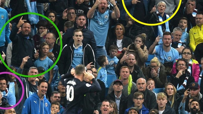 Става дума поне за две двойки бащи-синове и за още един фен на Манчестър Сити, които и в двубоя срещу Евертън бяха заели същи места н атрибуната и реагираха по почти същия начин.